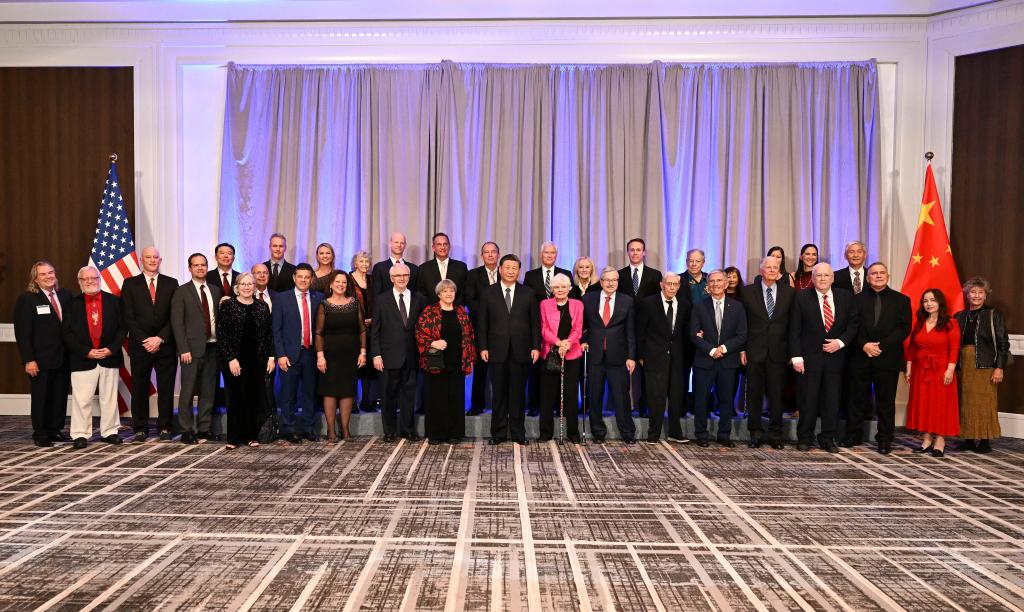 當(dāng)?shù)貢r(shí)間11月15日晚,國(guó)家主席習(xí)近平在美國(guó)舊金山出席美國(guó)友好團(tuán)體聯(lián)合舉行的歡迎宴會(huì)。這是宴會(huì)開始前,習(xí)近平會(huì)見飛虎隊(duì)和史迪威將軍后人、鼓嶺、艾奧瓦州、華盛頓州等方面友好人士代表,同他們親切交談并合影留念。