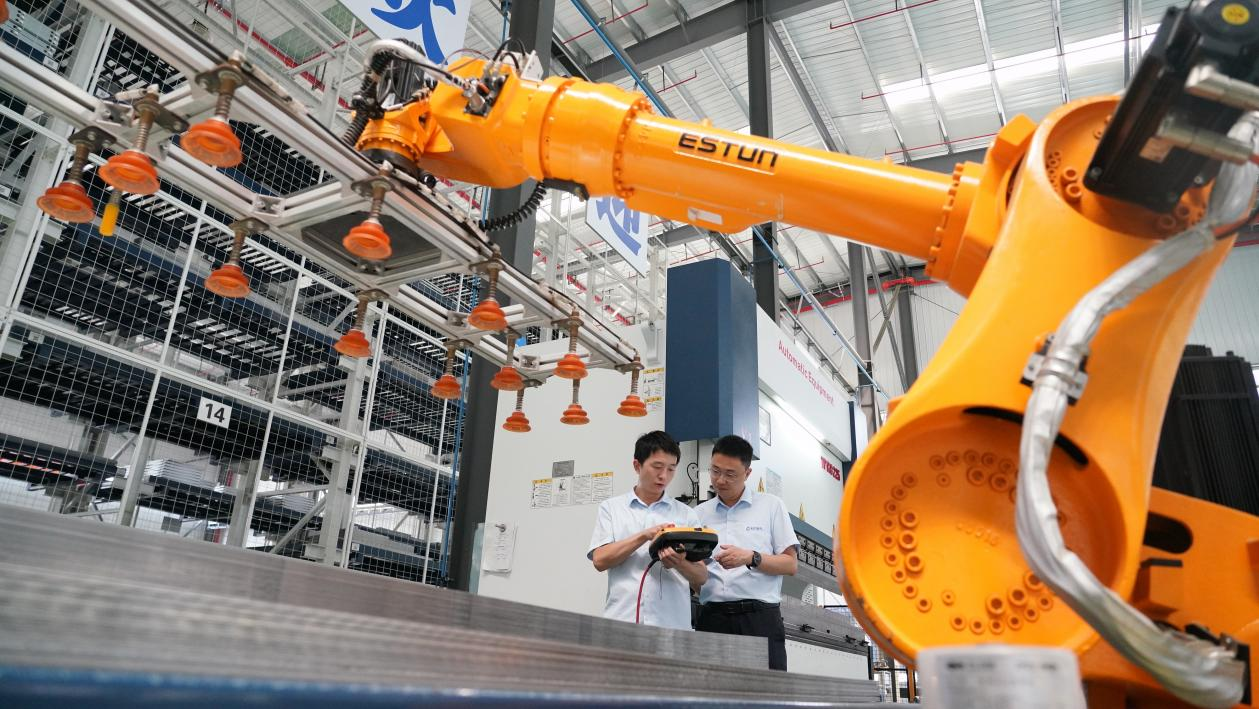 △2023年8月26日,在武漢光谷的一家長(zhǎng)江電氣企業(yè)智能車(chē)間,工作人員正在操作智能機(jī)械臂。