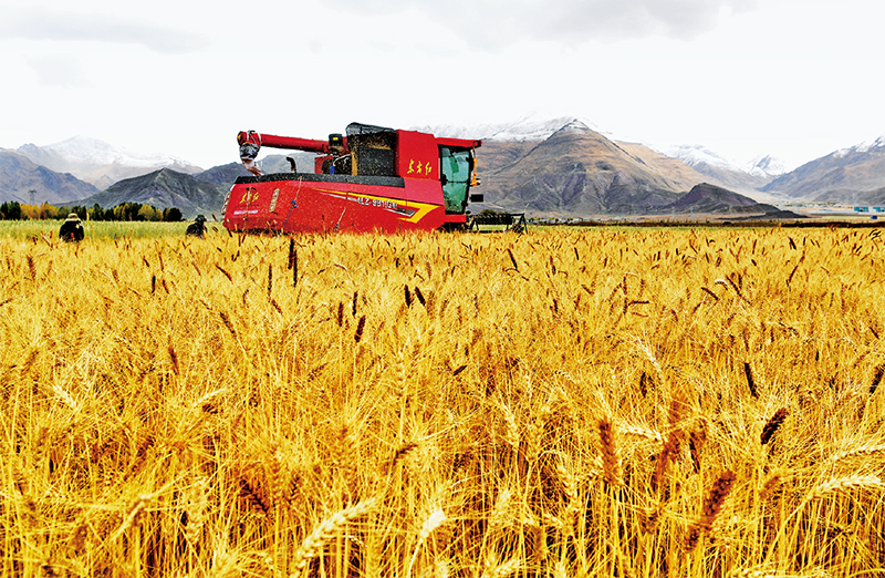 近年來,西藏自治區(qū)積極實(shí)施耕地改造,通過開展高標(biāo)準(zhǔn)農(nóng)田建設(shè),全方位提升耕地質(zhì)量與糧食產(chǎn)量,夯實(shí)糧食安全基礎(chǔ)。圖為工作人員駕駛農(nóng)業(yè)機(jī)械在拉薩市林周縣曲果強(qiáng)村的高標(biāo)準(zhǔn)農(nóng)田里收獲小麥(2023年10月12日攝)。 新華社記者 張汝鋒/攝