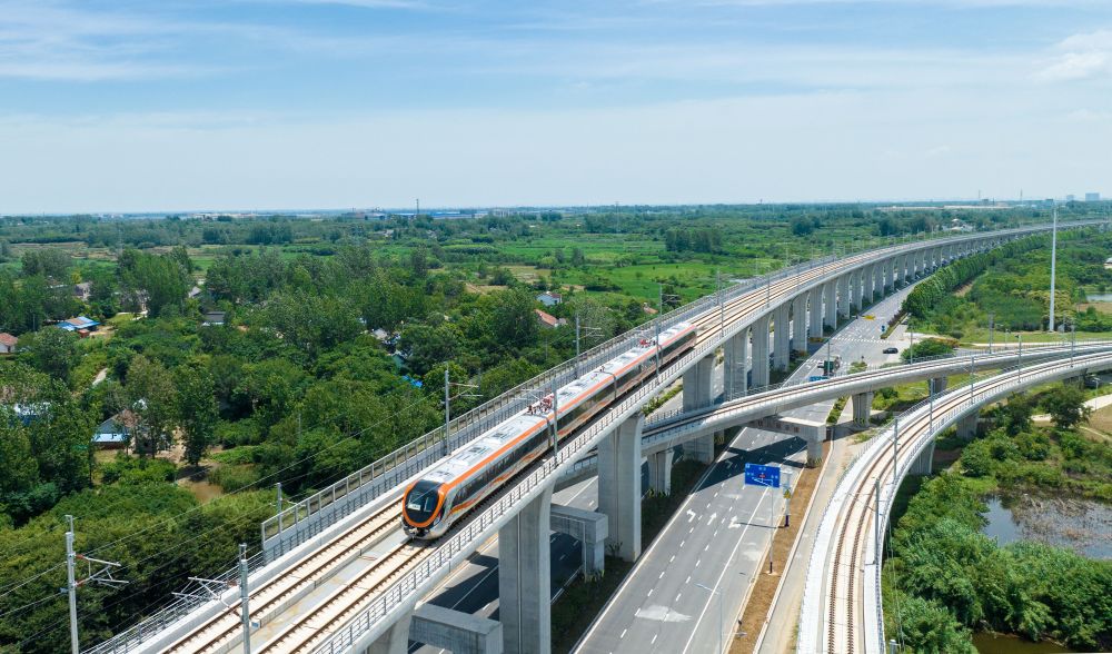 這是在安徽省滁州市來(lái)安縣境內(nèi)拍攝的滁寧城際鐵路列車(2023年6月28日攝,無(wú)人機(jī)照片)。當(dāng)日,滁寧城際鐵路滁州段開通運(yùn)營(yíng)。滁寧城際鐵路西起滁州高鐵站,止于正在規(guī)劃建設(shè)中的南京北站,全長(zhǎng)約55公里。