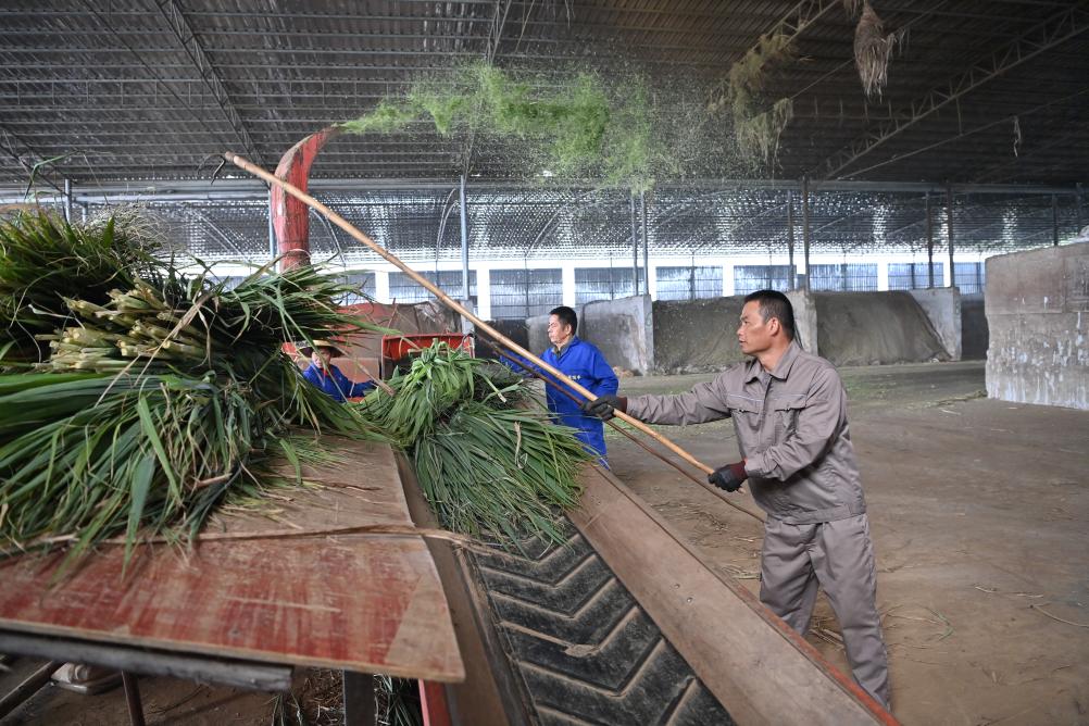 近日,在廣西來賓市一家養(yǎng)牛場,工作人員正將甘蔗尾梢加工成飼料。 新華社記者 周華 攝