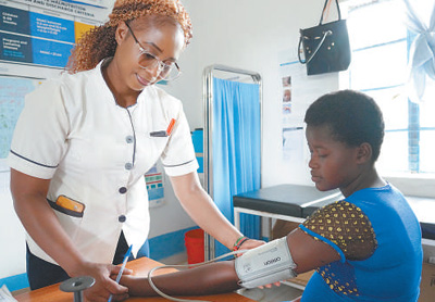 穆薩烏(左)為一名當(dāng)?shù)卦袐D測量血壓。