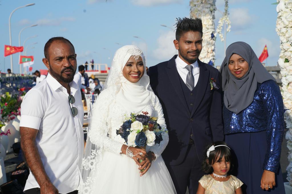 ??2018年8月31日,在剛剛正式通車的中馬友誼大橋上,一對(duì)馬爾代夫新婚夫婦與家人合影。