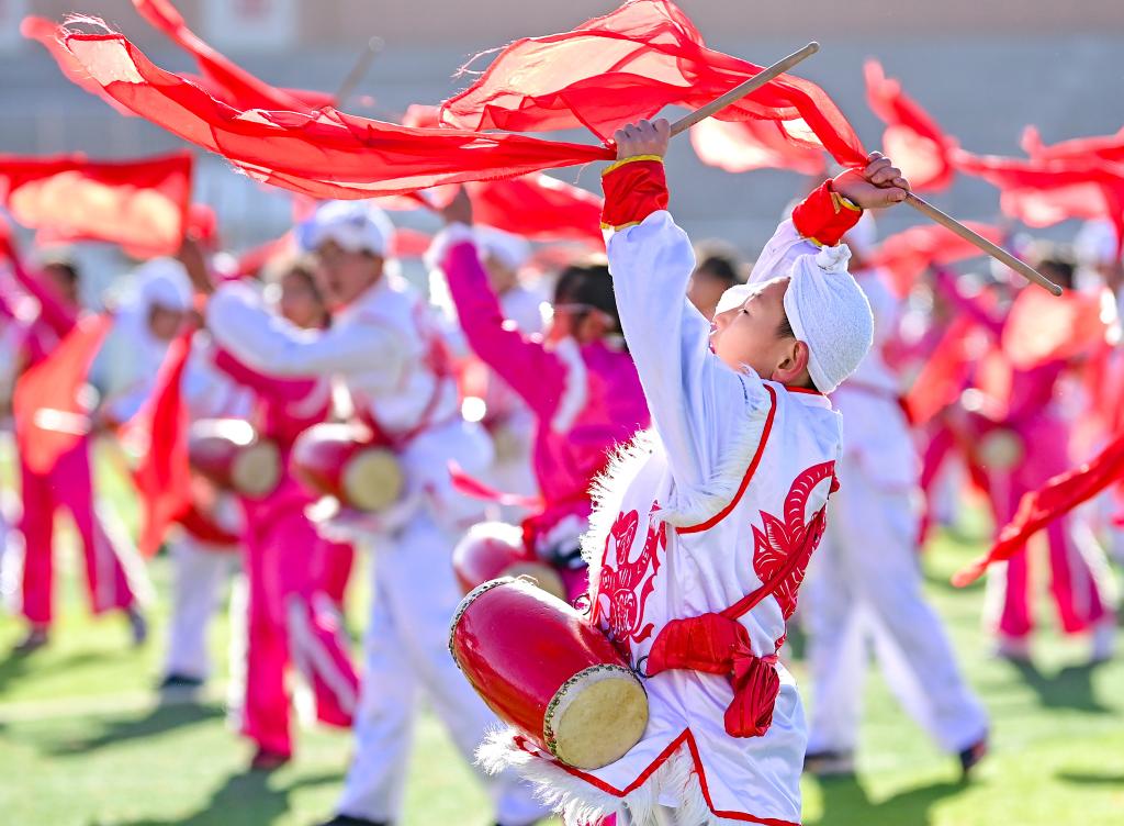 ??2023年11月16日,內(nèi)蒙古鄂爾多斯市鄂托克前旗第二小學(xué)的學(xué)生在大課間表演安塞腰鼓。該校將安塞腰鼓列入學(xué)校的校本課程和大課間活動,聘請民間藝人傳授技藝,讓非遺文化在校園中傳承。新華社發(fā)(王正攝)