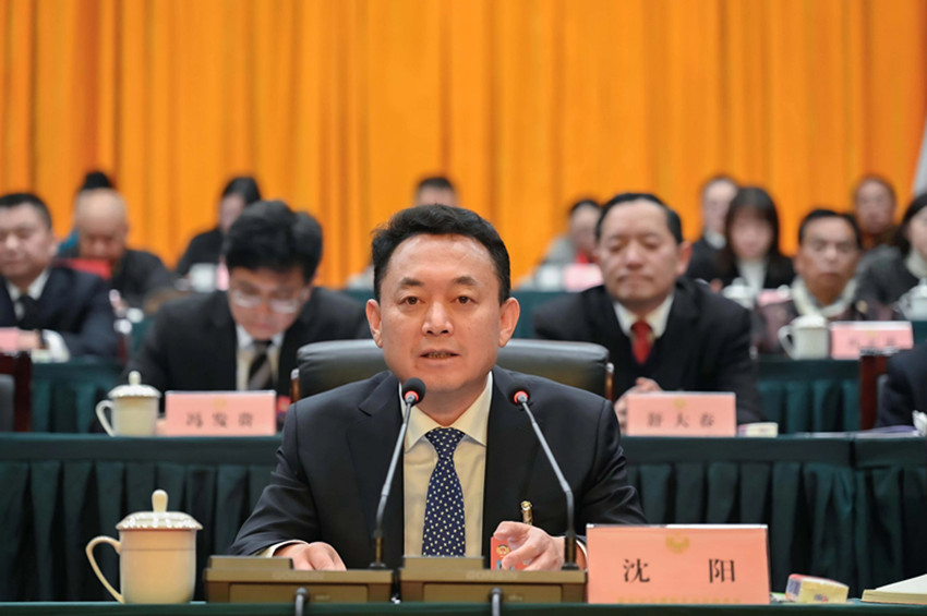 1月29日,甘孜藏族自治州第十三屆人民代表大會(huì)第三次會(huì)議、政協(xié)甘孜藏族自治州第十四屆委員會(huì)第三次會(huì)議在康定開幕,州委書記沈陽出席開幕會(huì)。圖為沈陽在州政協(xié)十四屆三次會(huì)議開幕會(huì)上講話。賴強(qiáng) 甲央讓布 攝