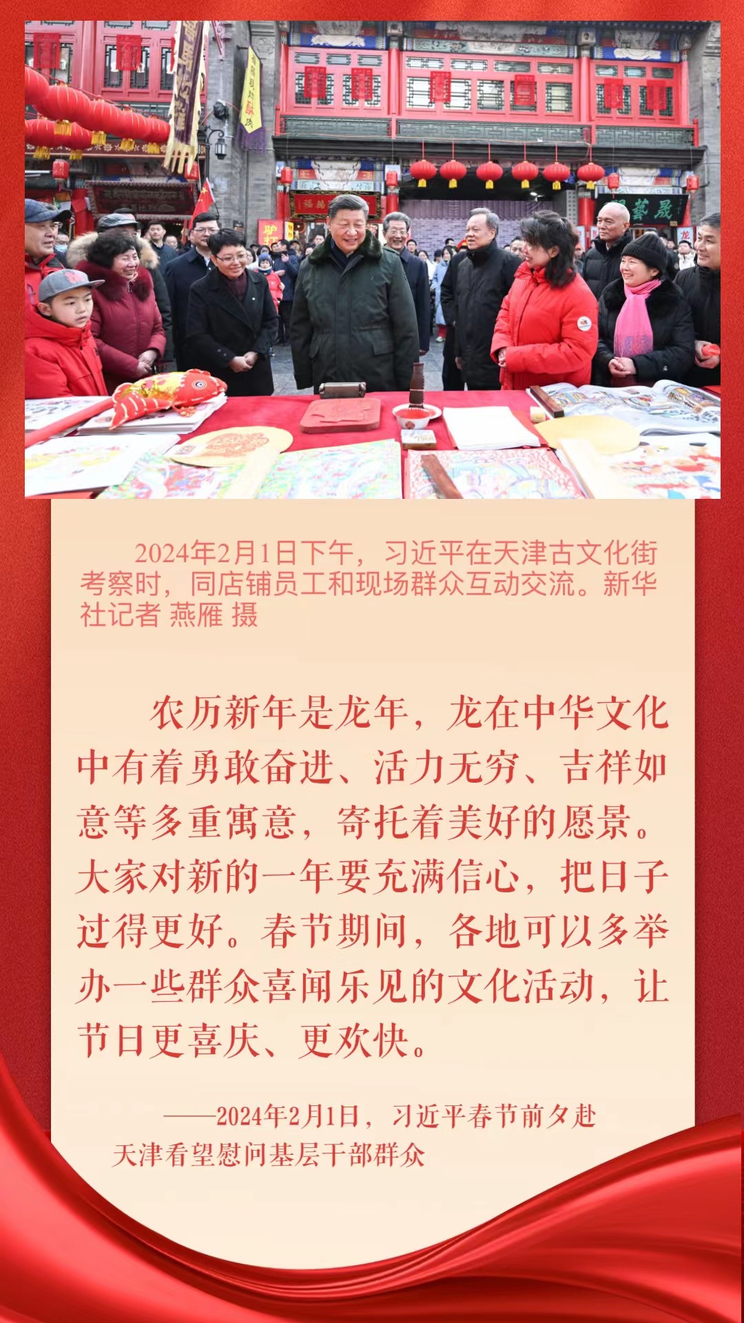 改善人居環(huán)境要保護歷史文化底蘊,發(fā)展經(jīng)濟、服務百姓的同時,要注意弘揚民族文化和傳統(tǒng)文化。黨的十八大以來,習近平總書記在地方考察調(diào)研時多次強調(diào),中國式現(xiàn)代化離不開優(yōu)秀傳統(tǒng)文化的繼承和弘揚,叮囑各地要讓歷史文化和現(xiàn)代生活融為一體,更好弘揚中華優(yōu)秀傳統(tǒng)文化,更好服務經(jīng)濟社會發(fā)展和人民高品質(zhì)生活。在春節(jié)這個中華民族傳統(tǒng)節(jié)日,一起來重溫!