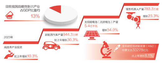 發(fā)展壯大戰(zhàn)略性新興產(chǎn)業(yè)。“戰(zhàn)略性新興產(chǎn)業(yè)具有創(chuàng)新活躍、技術(shù)密集等特點,為新質(zhì)生產(chǎn)力發(fā)展壯大提供了巨大空間。”高文代表說,近年來,我國戰(zhàn)略性新興產(chǎn)業(yè)蓬勃發(fā)展,目前戰(zhàn)略性新興產(chǎn)業(yè)占GDP比重約13%。