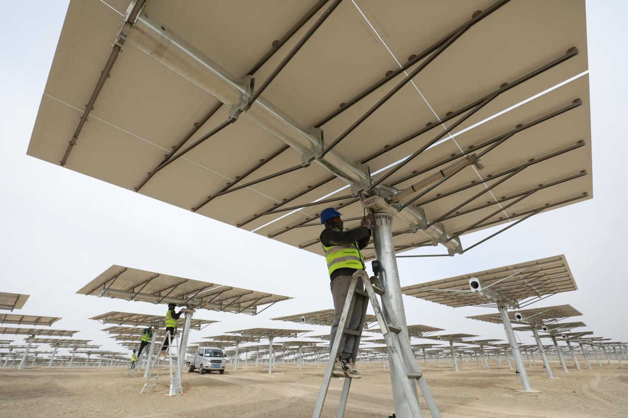 △ 2024年3月12日,甘肅省酒泉市金塔中光太陽能10萬千瓦光熱+60萬千瓦光伏項目現(xiàn)場,施工人員有序作業(yè)。