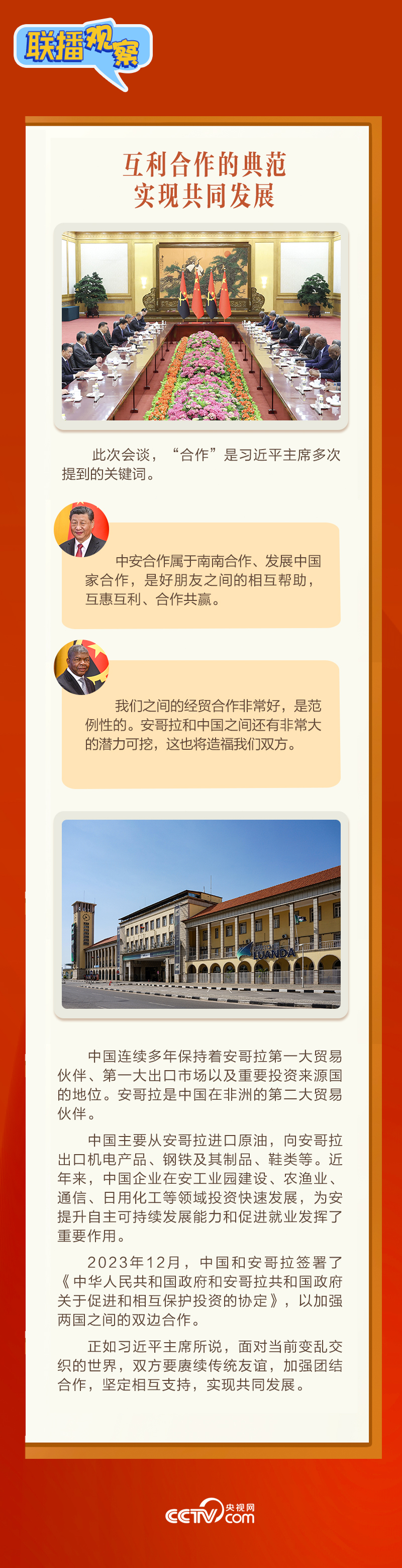 聯(lián)播+3月15日,習(xí)近平主席在人民大會堂同來華進(jìn)行國事訪問的安哥拉總統(tǒng)洛倫索舉行會談。會談中,習(xí)主席稱洛倫索總統(tǒng)為“中國人民的老朋友”,評價中安關(guān)系“歷經(jīng)國際風(fēng)云變幻考驗(yàn),實(shí)實(shí)在在造福了兩國人民”。