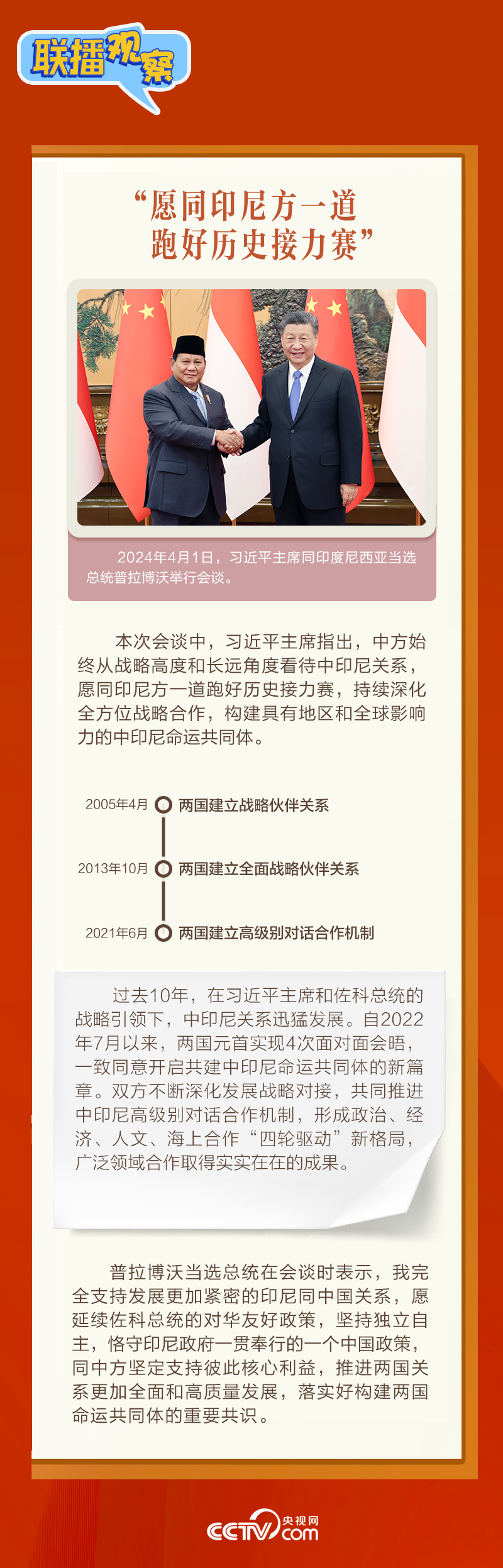會(huì)談中,習(xí)主席以“船”為喻,稱贊“中印尼友好之輪始終破浪向前”,強(qiáng)調(diào)“愿同印尼深化全方位戰(zhàn)略合作,構(gòu)建具有地區(qū)和全球影響力的中印尼命運(yùn)共同體”。普拉博沃當(dāng)選總統(tǒng)表示“中國是印尼強(qiáng)有力的合作伙伴”,并指出“完全支持發(fā)展更加緊密的印尼同中國關(guān)系”。