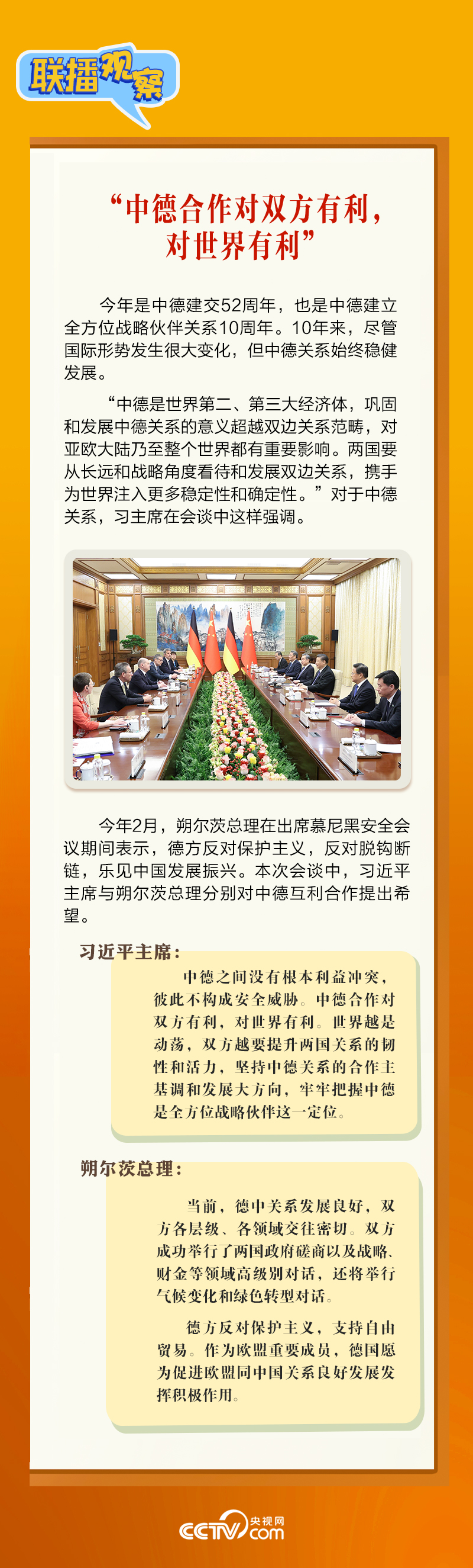 4月16日上午,習(xí)近平主席在北京釣魚臺(tái)國(guó)賓館會(huì)見朔爾茨總理。會(huì)見中,習(xí)主席強(qiáng)調(diào),要“牢牢把握中德是全方位戰(zhàn)略伙伴這一定位”。中德建立全方位戰(zhàn)略伙伴關(guān)系10年來(lái),兩國(guó)如何共同發(fā)展,相互成就?央視網(wǎng)《聯(lián)播觀察》帶您了解。