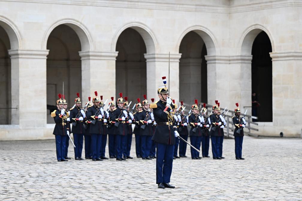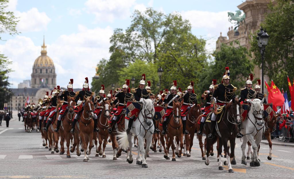 ??當(dāng)天下午,習(xí)近平在巴黎出席馬克龍舉行的隆重盛大歡迎儀式。兩國元首檢閱法蘭西共和國衛(wèi)隊(duì)和陸??杖妰x仗隊(duì),并觀看分列式。