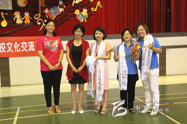▲巴塘縣委常委、宣傳部長(zhǎng)張平樹(shù),巴塘縣政府副縣長(zhǎng)王文英向臺(tái)中市北區(qū)太平小學(xué)回贈(zèng)哈達(dá)和吉祥結(jié)。