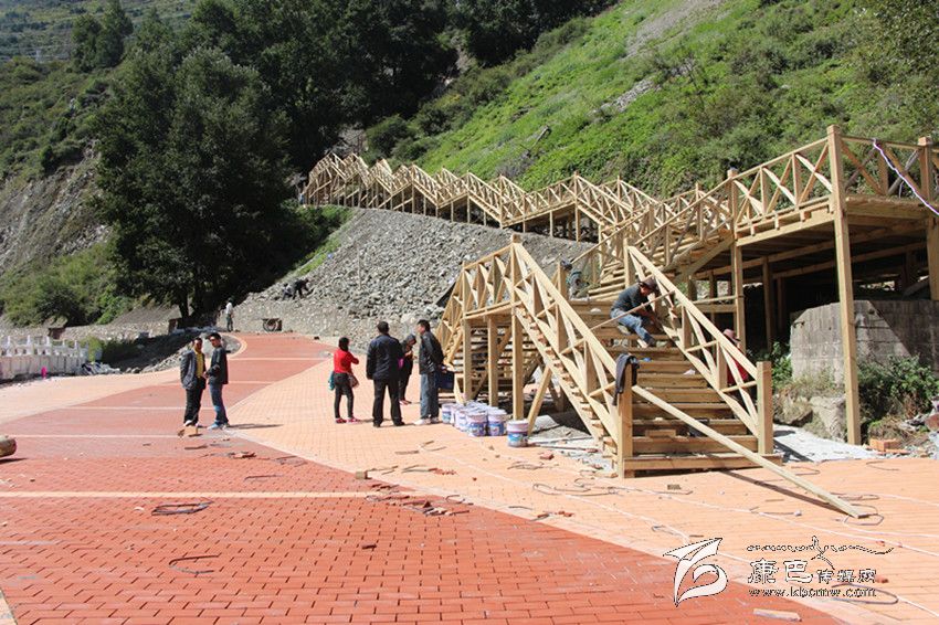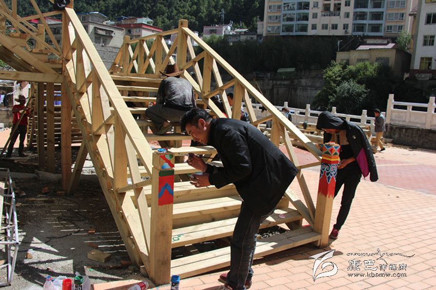 “在深秋艷陽的照射下,環(huán)山路木質(zhì)棧道的長廊上圖案絢麗色調(diào)鮮明。現(xiàn)場有序地堆放著紅色的地磚和白色的木材。藏族畫匠在專心描摹,工人們的鋸子有節(jié)奏地發(fā)出聲音。在公主橋的施工現(xiàn)場,村民們有說有笑地忙著平路基,抬石頭、撮泥巴、砌墻。”這是近日筆者在康定文成環(huán)山路施工現(xiàn)場看到的熱鬧場面。