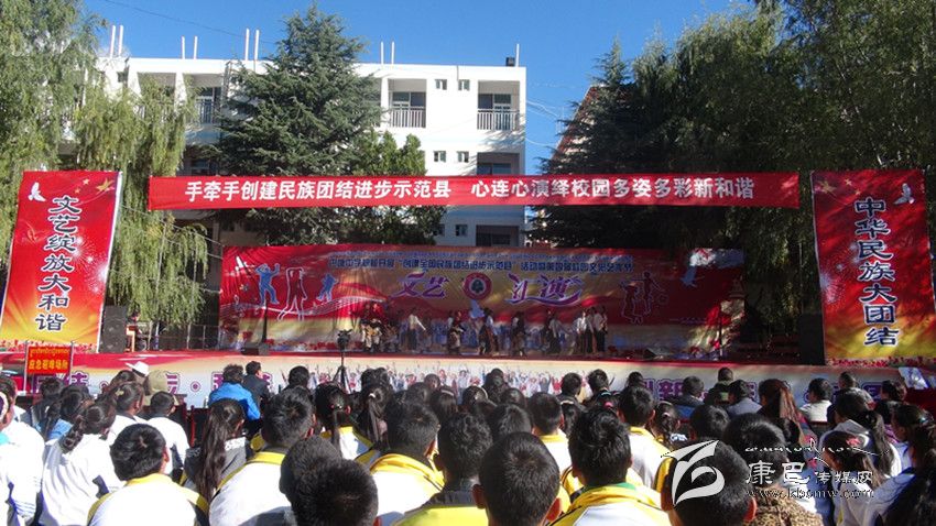 “手牽手創(chuàng)建民族團(tuán)結(jié)進(jìn)步示范縣·心連心演繹校園多姿多彩新和諧”被確定為本次活動的主題。輕快的音樂,靈動的舞步,具有濃郁藏民族特色的《炫舞鍋莊》拉開文藝表演的帷幕。表演者穿戴藏族服飾載歌載舞,盡情表演,瞬時將氣氛推向了高潮。文藝表演以學(xué)生的班級和教師的教研組為單位,將各自班級或教研特色融入到表演中,特別是一曲《做不到》,兩名男女中學(xué)生將學(xué)生時期的叛逆思想和對未來美好生活的向往展現(xiàn)得淋漓盡致。大合唱《我相信》,盡現(xiàn)了全班同學(xué)的團(tuán)隊精神。同學(xué)們個個精神抖擻、氣勢如虹,唱出了對未來的無限希翼。表演持續(xù)2個多小時,教師和學(xué)生們將他們精心編排、傾情演繹的一個個精彩節(jié)目呈現(xiàn)給現(xiàn)場觀眾。
