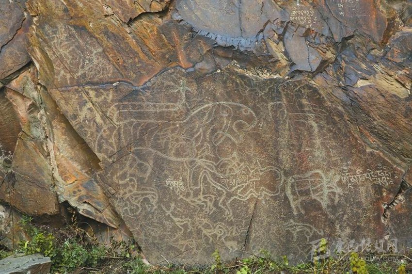 省考古院李飛介紹,其中一處巖畫上,還能看到古藏文的題記。這些圖像均為密點鑿刻,創(chuàng)作者先用細(xì)線在崖壁上刻劃出輪廓,再通過密點敲鑿出圖像。它們中,有的是通體剪影式,有的則是粗線條輪廓式。
