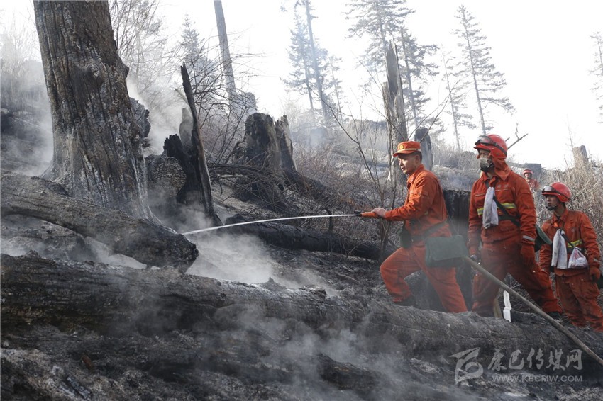 2月10日,火頭蔓延至火場東北一線,參戰(zhàn)官兵發(fā)現(xiàn)幾處被冰雪覆蓋的水源,火場前指決心改變戰(zhàn)法,采用7組水泵串聯(lián)接力向火場供水主攻明火,常規(guī)機(jī)具輔助配合消除煙點的方式,將部隊分為水泵和常規(guī)機(jī)具兩個梯隊,在火場火勢最為猛烈的東北側(cè)展開滅火作戰(zhàn)。參戰(zhàn)官兵用自身攜帶的鍬鎬奮力破冰面抽水,在水泵的助力下,明火得到了有效壓制并逐步熄滅。隨后,部隊和地方群眾全部轉(zhuǎn)入火場清理看守階段。