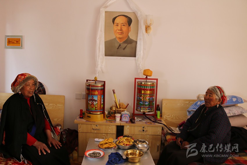 從餐廳出來(lái),記者走進(jìn)了一間15平方米左右的宿舍。兩位老人正坐在各自的木床上看電視,墻上掛著的液晶電視是連著機(jī)頂盒的。兩床之間,放著藏桌和床頭柜,藏桌上有瓜子、花生、酥油果子、牛肉等食品,亞瑪翁青老人熱情地說(shuō):“因?yàn)檎谶^(guò)藏歷新年,這些都是福利院為我們備的年貨,你也嘗嘗!”。房間里最引人注目的便是掛在床頭柜上方的系著哈達(dá)的毛主席畫(huà)像,兩位老人指著毛主席畫(huà)像動(dòng)情地說(shuō):“毛主席、共產(chǎn)黨是我們的恩人,看著他的畫(huà)像我們安心?!贝送?,房間里還有衣柜、配有馬桶的獨(dú)立廁所和盥洗臺(tái),毛巾、漱口盅、掃把、拖把都整齊地放在對(duì)應(yīng)位置。亞瑪翁青笑著說(shuō):“我們住的房間都趕得上縣城里的賓館了?!?/span>