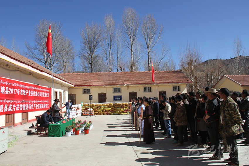 在農(nóng)科所院壩,擺放著縣委政府多方籌資,縣農(nóng)牧和科技局調(diào)運(yùn)和貯備脫毒馬鈴薯種60萬公斤,青稞良種30萬公斤、農(nóng)膜10噸、肥料120噸、各類蔬菜油菜良種3000公斤,35萬元的黑木耳菌種,分發(fā)給24個鄉(xiāng)鎮(zhèn)、37個脫貧村。為趕這趟“理塘縣2017年農(nóng)牧產(chǎn)業(yè)扶貧放心農(nóng)資發(fā)放儀式”、“理塘縣成片成帶推進(jìn)特色產(chǎn)業(yè)發(fā)展啟動儀式”,降央吉稱專門起了個大早,開著拖拉機(jī)“趕”了兩個小時到了農(nóng)科所。