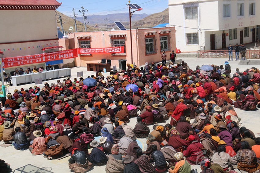 白玉縣牧區(qū)納塔鄉(xiāng),高原烈日下,1000多牧民和僧人盤腿坐在地上,聚精會神聆聽,麥克風(fēng)里傳出抑揚(yáng)頓挫的藏語,本地諺語、民間故事配合著扶貧政策、法律法規(guī),通過一個個生動的比喻,回響在牧民耳畔。