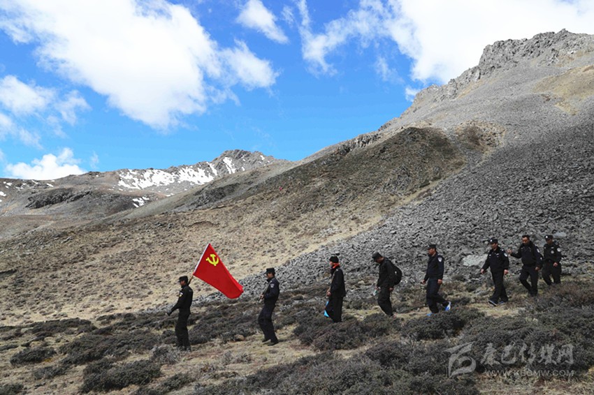 為確保蟲草采挖期間的社會(huì)治安穩(wěn)定,縣公安局抽調(diào)精干力量,前往哈幾山、莫庫(kù)溝等多個(gè)蟲草采挖點(diǎn)開展巡山維穩(wěn)。這次和我們一起開展常規(guī)巡邏的共有8名公安干警。降初是本地人,1.78米的個(gè)子,一路上,他高舉黨旗、步履矯健、勇往直前,成為我們大家的“領(lǐng)路人”,大家經(jīng)常和他開玩笑說(shuō):“跟著黨(旗)走永遠(yuǎn)不迷路”。