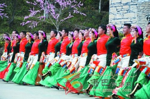 10月26日,在甲居藏寨,處處洋溢著豐收和歡樂的氣氛,人們扶老攜幼,身著節(jié)日的盛裝走到一起,來共同慶祝丹巴嘉絨風情節(jié)的順利召開。在一塊空地中,搭建了臨時的舞臺,看臺上,幾座古碉模型傲然挺立,在不遠處,一座古碉矗立在一座小山包上,與古碉模型遙相呼應、相映成趣。上午9時40分,當節(jié)目主持人宣布嘉絨風情節(jié)正式開始時,一束束搖曳的煙花向空中飛去,在空中炸響后,散發(fā)出五顏六色的煙霧,其中有的還幻化成幾多小小的降落傘,就像多多盛開的鮮花在空中綻放。演出現(xiàn)場前的大地和遠處的小山坡上到處都站滿了熱情的觀眾,合著禮花的爆裂時的響聲,將手中的小紅旗展開,高舉過頭頂,有節(jié)奏的左右搖動,霎時間,整個現(xiàn)場成為了紅色的海洋。