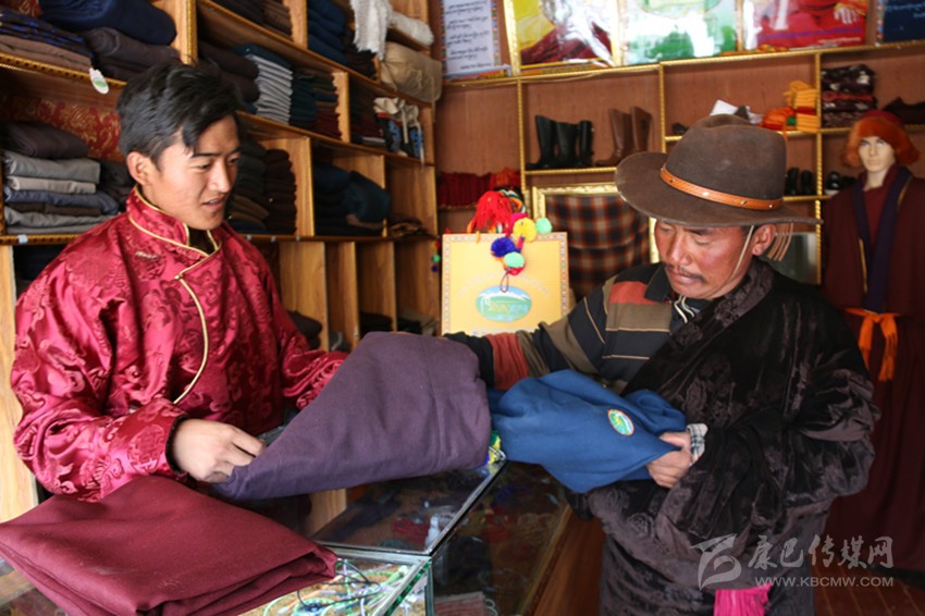 安孜鄉(xiāng)作為白玉縣海拔較高的鄉(xiāng)鎮(zhèn)之一,夏天是十分短暫的,連日來的晴好天氣,也透著絲絲寒氣。牧民阿剛想要量身定做一套過冬的藏裝,8月26日,他來到白玉縣阿察鎮(zhèn),一家民族服飾商貿(mào)公司吸引了他的目光?!拔覀冞@里的服裝面料是本地羊毛和從浙江進(jìn)的上等面料,做工考究,很多工序是純手工制作,服裝樣式你可以根據(jù)你的喜好指定,我們包你滿意?!钡陠T仁真熱情地介紹。聽了仁真的介紹,阿剛用手捻了一下服裝用料的質(zhì)地,看到印有“祥陽措”商標(biāo)的精美包裝袋,商店里擺放的五彩斑斕、高端大氣的藏式男女服裝,他有些動心了?!吧a(chǎn)這些服裝的都是我們納塔鄉(xiāng)的牧民,你可以考察我們的服裝用料、生產(chǎn)流程,再作打算?!比收鏌崆檠笠绲亟榻B說。