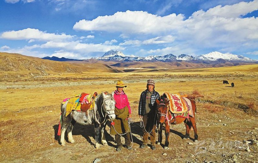 本網(wǎng)訊(劉鈞 文/圖)作為康定市純牧業(yè)鄉(xiāng)鎮(zhèn)的塔公鎮(zhèn),今年7月全力推進(jìn)綜合整治以來(lái),實(shí)現(xiàn)牧旅結(jié)合,塔公草原天更藍(lán)水更綠,成為游客向往的天堂。初冬的塔公草原,下馬龍村牧民石多(左)正和同伴為游客提供騎游服務(wù)。