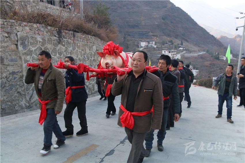 5個(gè)村民將年豬抬到秤上。360斤。村民為年豬準(zhǔn)備大紅花。準(zhǔn)備紙錢、香蠟。9點(diǎn)整,殺豬匠開始了他的工作,在眾人齊心協(xié)力下,光溜溜的年豬被打整干凈。“保佑我們村來(lái)年風(fēng)調(diào)雨順、五谷豐登,村民平安健康?!贝逯欣险呔催^(guò)天地后,8個(gè)身強(qiáng)力壯的村民站在年豬旁,豎著拇指齊聲說(shuō),今年家家戶戶還要養(yǎng)大肥豬。抬著年豬,村里的中老年人簇?fù)碇咴谧钋懊妫鴲偠拿裰{,大意是歌唱幸福生活的,迎著2018年的第一縷陽(yáng)光,村民們喜氣洋洋。到村里來(lái)的游客蜂擁拍照。