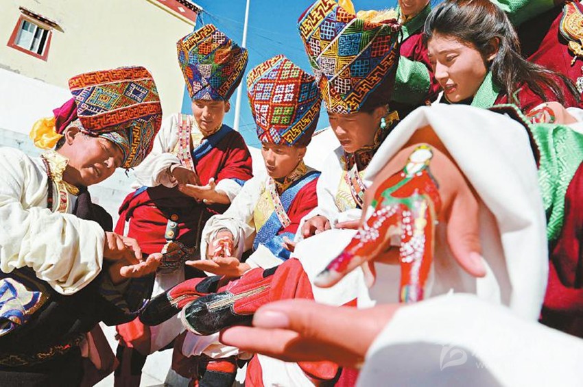 2017年12月22日,白玉縣城陽光普照,縣藝術(shù)團一群“90后”藏族演員用顏料相互在食指和中指上熟練地繪制著具有當?shù)孛袼滋厣娜宋飯D案。音樂響起,演員們的手指隨著節(jié)拍翩翩起舞,左挪右轉(zhuǎn)。隨著唱詞和曲調(diào)的變化,手指的動作幅度和節(jié)奏也隨之變化。藝人的情感起伏、喜怒哀樂被“小人”般的手指表現(xiàn)得淋漓盡致。