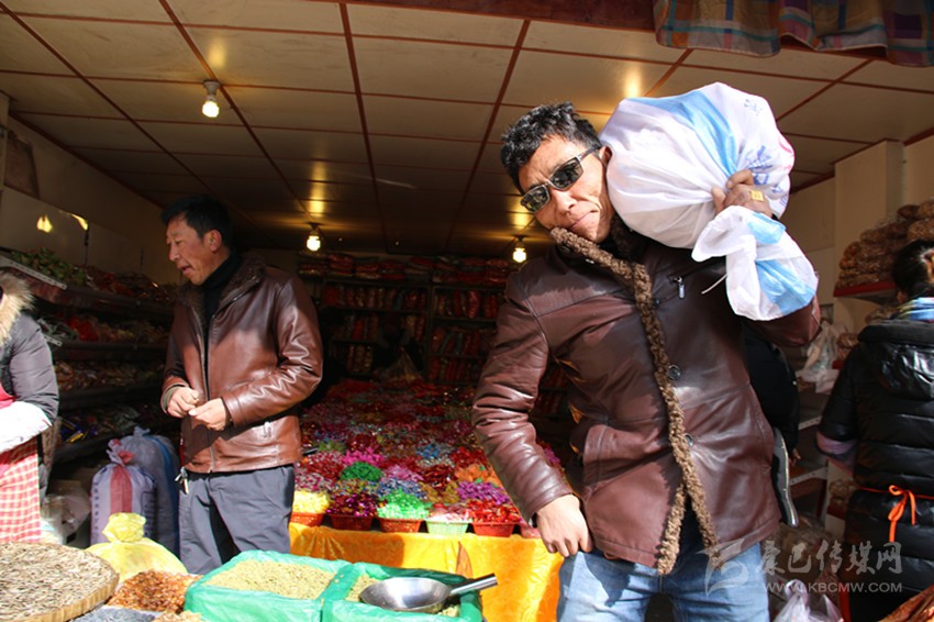 走進(jìn)郭達(dá)橋重康糖果店,洛讓說(shuō):“多買(mǎi)點(diǎn)糖果糕點(diǎn),娃娃老婆喜歡。”然后照單點(diǎn)貨:花生10斤、瓜子5斤、葡萄干5斤、水果糖5斤、軟糖5斤、炒米糖10斤……一下就指點(diǎn)了八九種糖果糕點(diǎn)??吹搅诉@樣的生意,老板樂(lè)開(kāi)了花。與洛讓大包大攬的氣派不同,長(zhǎng)期經(jīng)商的扎西老練地詢(xún)價(jià):“老板,我們買(mǎi)這么多,要優(yōu)惠喲。”一番討價(jià)還價(jià)之后,洛讓和扎西買(mǎi)了十種糖果,用去1066元,裝滿(mǎn)整整兩編織袋。洛讓把糖果過(guò)扛在肩上,對(duì)筆者說(shuō):“你來(lái)試一下,有點(diǎn)分量,你別說(shuō),辦年貨也是一種體力活喲。”