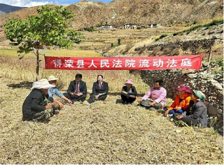 在曲雅貢鄉(xiāng)二號壩村進(jìn)行法律宣講時,村民澤某請求法院判決其和丈夫扎某離婚,“流動法庭”法官立即在田間地頭組織調(diào)解。調(diào)解過程中當(dāng)事人情緒抵觸、相互埋怨,尤其涉及到財產(chǎn)分割和子女撫養(yǎng)等問題時情緒波動大,場面一度僵持。法官憑借豐富的調(diào)解經(jīng)驗(yàn),先從講解相關(guān)法律規(guī)定入手,告知當(dāng)事人享有的權(quán)利義務(wù),而后對離婚財產(chǎn)分割、子女撫養(yǎng)問題從情理法多角度層層剖析,促使雙方達(dá)成和解協(xié)議,有效化解了矛盾?!傲鲃臃ㄍァ币孕僬{(diào)、以案說法,達(dá)到了審理一案、教育一片、穩(wěn)定一方的效果。