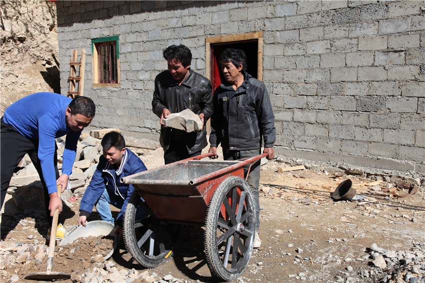 俗話說(shuō),一方水土養(yǎng)一方人,當(dāng)一方水土不能養(yǎng)活一方人時(shí),移民搬遷就成了最好選擇。這個(gè)行動(dòng)遲緩的中年男子名叫洛絨,今年48歲。他眼前的這幢建筑面積100平方米的磚混結(jié)構(gòu)單層房子,盡管室內(nèi)地面還沒(méi)灌注水泥,房?jī)?nèi)還沒(méi)裝修,但他對(duì)即將入住新房的那份喜悅一覽無(wú)余:“你看,這房子的前面是河、后面是山,太陽(yáng)一出來(lái)就能照著,住起來(lái)肯定舒服;這三間房子就有四個(gè)大窗戶,光線照得進(jìn)來(lái),里面肯定亮堂;這一進(jìn)門(mén)就是客廳,兩邊各有一套大大的房間,裝修好后只要把家具家電一擺上,肯定漂亮;……”正當(dāng)他說(shuō)得津津有味時(shí),鄉(xiāng)上負(fù)責(zé)易地扶貧搬遷干部馬煜和包村干部鄭剛突然出現(xiàn)了他的眼前,他滿是感激地說(shuō):“其實(shí),我知道你們都很忙,用不著隔三差五過(guò)來(lái)幫我,我保證十天之內(nèi)就把地面填平。況且再過(guò)幾天,我愛(ài)人就從山上挖蟲(chóng)草回來(lái)了。有她打下手,兩個(gè)月內(nèi)我們一家人肯定就能住進(jìn)新房子啦!”