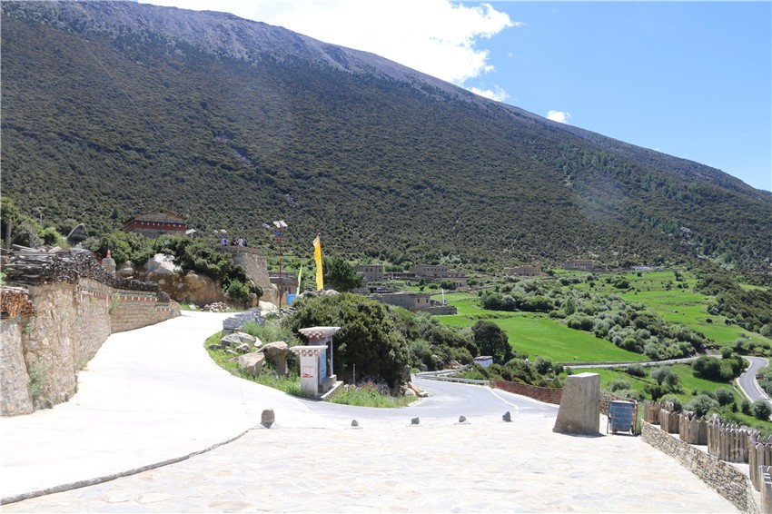 從觀景平臺(tái)向村子進(jìn)發(fā),一棟棟用石塊砌成的藏房次第映入眼簾,每一棟藏房都有獨(dú)立的院落,院墻上是堆放整齊的木柴,墻邊是造型別致的花臺(tái),有的房頂上還掛著五星紅旗。走到村口,黑化通村路變成了硬化聯(lián)戶路,道路寬敞整潔,路旁有太陽能路燈、電子監(jiān)控、綠化花草和公共廁所;村中央的廣場(chǎng)上聚滿了人,他們有的是外來游客、有的是當(dāng)?shù)卮迕瘢械脑跁裰栭e聊,有的在對(duì)著美景拍照。在村里,記者還發(fā)現(xiàn)有幾個(gè)小賣部、不少私家車和好幾大片長(zhǎng)勢(shì)良好的菜地,地里有一些人在勞作。