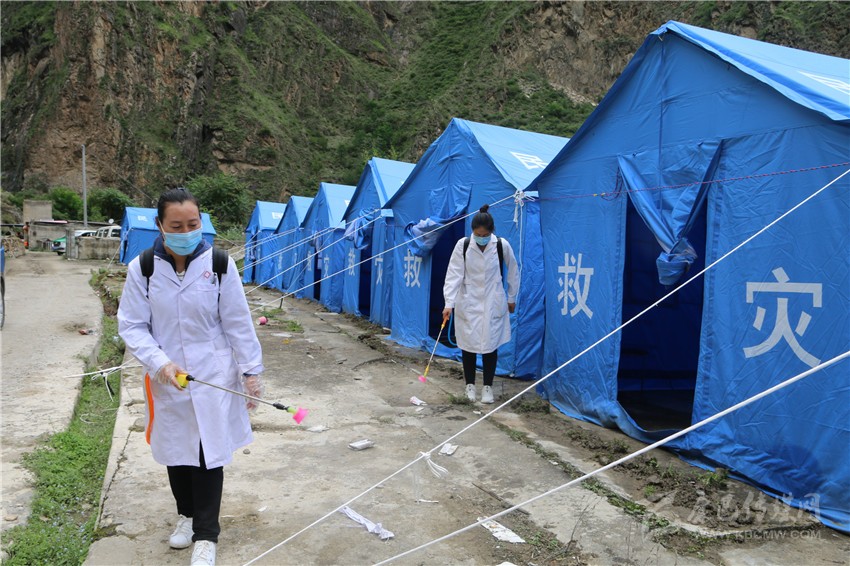 丹巴縣衛(wèi)生系統(tǒng)工作人員在臨時(shí)安置點(diǎn)開展消殺工作。