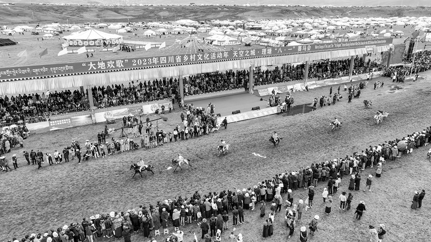 “中國(guó)藏族賽馬文化之鄉(xiāng)”“理塘八一傳統(tǒng)賽馬會(huì)”是四川涉藏州縣規(guī)模最大的賽馬會(huì),賽馬傳統(tǒng)延續(xù)長(zhǎng)達(dá)400余年?!霸缇吐?tīng)說(shuō)過(guò)馬背上的理塘,今天終于親眼所見(jiàn),實(shí)在不虛此行。草原追風(fēng),策馬飛奔,蹄聲如雷,震徹山野,這是多么壯美的理塘萬(wàn)馬奔騰圖啊!多想遠(yuǎn)離城市的喧囂,策馬揚(yáng)鞭,馳騁草原,豪邁瀟灑,勇往直前。以后每一年的理塘賽馬活動(dòng),我一定會(huì)帶上家人再來(lái)這里,因?yàn)槔硖?,可謂是心靈棲息的地方?!痹凇按蟮貧g歌”2023年四川省鄉(xiāng)村文化活動(dòng)年——天空之城·理塘“八·一”賽馬會(huì)上,來(lái)自北京的游客石磊被當(dāng)?shù)刭愸R文化吸引,和朋友玩得不亦樂(lè)乎。