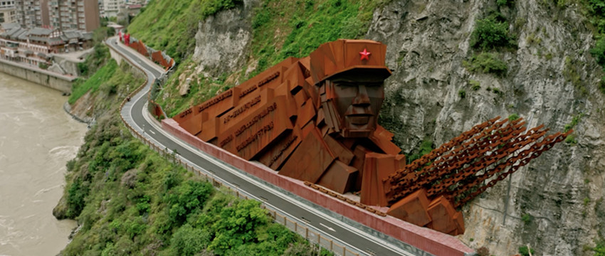 4月20日,大渡橋橫,春和景明。漫步于瀘定縣瀘橋鎮(zhèn)河東片區(qū)的濱河廣場,對岸河西片區(qū)的海子山下,“驚險奇絕”的景觀墻映入眼簾。自南向北遠眺,入目的是巨大的耐候鋼塑紅軍主題雕像群,由主雕“勇士魂”及“飛”“奪”兩組副雕構成敘事動線,重溫再現(xiàn)撼人心魄的恢弘歷史。