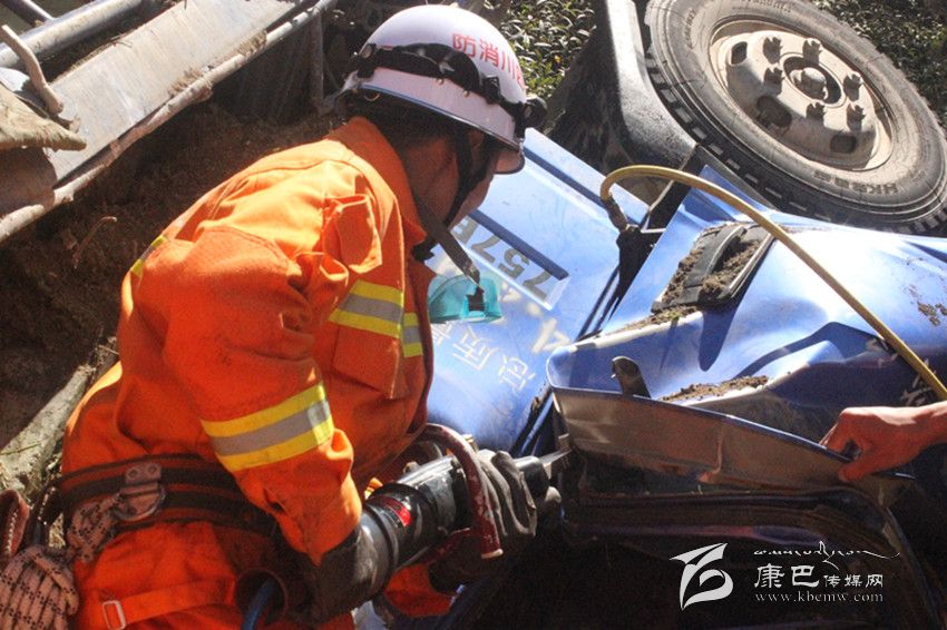接警后,支隊(duì)指揮中心賡即調(diào)集1臺搶險救援車和8名消防官兵火速趕往事發(fā)現(xiàn)場,實(shí)施救援。10時43分左右,消防官兵抵達(dá)事發(fā)現(xiàn)場。經(jīng)現(xiàn)場調(diào)查,了解側(cè)翻卡車是因剎車失靈發(fā)生事故,車頭被嚴(yán)重?cái)D壓變形,駕駛室中有一名被困人員被卡住無法動彈。現(xiàn)場情況十分緊急,指揮員立即組織安全員對事故現(xiàn)場安置警戒帶、警戒標(biāo)識;破拆小組利用液壓擴(kuò)張剪斷器等救援器械對車內(nèi)被困人員實(shí)施破拆救援。20分鐘后,在消防官兵的努力下,受困人員被成功救出。