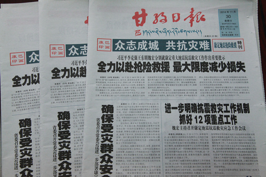 又訊 此外,自康定地震發(fā)生以來(lái),本報(bào)藏漢文報(bào)廣大編采人員發(fā)揚(yáng)連續(xù)作戰(zhàn)的精神,已經(jīng)連續(xù)9天不分白天黑夜地工作,保證了一線有記者的身影,后方編輯及時(shí)發(fā)聲,截止30日,本報(bào)藏漢文報(bào)已經(jīng)出版13期《眾志成城 共抗災(zāi)難》專刊和一期特刊,共計(jì)72個(gè)版面;本報(bào)《康巴傳媒網(wǎng)》自開辦網(wǎng)站以來(lái),首次實(shí)現(xiàn)了網(wǎng)站信息即時(shí)更新、滾動(dòng)發(fā)布,網(wǎng)站日上稿量超過(guò)100條,日點(diǎn)擊量均超過(guò)10萬(wàn)人次;本報(bào)微信平臺(tái)則采用短平快的方式,第一時(shí)間發(fā)布最新資訊,引導(dǎo)公眾情緒,傳播黨委政府的聲音,微信日點(diǎn)擊和轉(zhuǎn)發(fā)量超過(guò)2萬(wàn)人次;除此之外,本報(bào)承辦的手機(jī)報(bào)也發(fā)揮了巨大的作用。