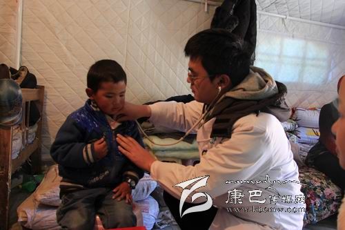 在新都橋鎮(zhèn)東俄洛三村的一頂救災帳篷里,來自“雅安市抗震救災醫(yī)療救援小組石棉分隊”的石棉縣人民醫(yī)院內科醫(yī)生李登豐正在給當地兒童土登多吉檢查身體。土登多吉的母親說孩子這兩天感冒了,經過檢查,李登豐發(fā)現土登多吉并未發(fā)燒,只是扁桃體有點發(fā)炎,于是趕緊讓同行的護理人員拿來了治療感冒和消炎的藥物。