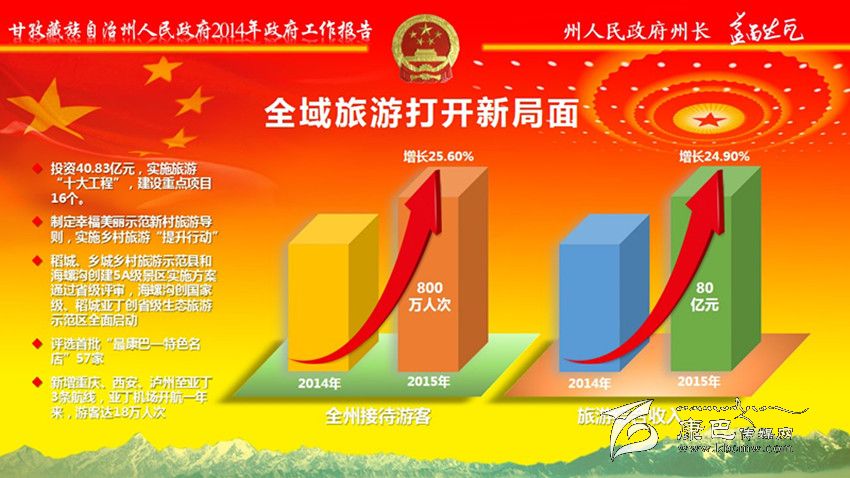 全域旅游打開新局面。投資40.83億元,實(shí)施旅游“十大工程”,建設(shè)重點(diǎn)項(xiàng)目16個(gè)。制定幸福美麗示范新村旅游導(dǎo)則,實(shí)施鄉(xiāng)村旅游“提升行動(dòng)”;稻城、鄉(xiāng)城鄉(xiāng)村旅游示范縣和海螺溝創(chuàng)建5A級(jí)景區(qū)實(shí)施方案通過(guò)省級(jí)評(píng)審,海螺溝創(chuàng)國(guó)家級(jí)、稻城亞丁創(chuàng)省級(jí)生態(tài)旅游示范區(qū)全面啟動(dòng);評(píng)選首批“最康巴——特色名店”57家。新增重慶、西安、瀘州至亞丁3條航線,亞丁機(jī)場(chǎng)開航一年來(lái),游客達(dá)18萬(wàn)人次。全州接待游客800萬(wàn)人次,實(shí)現(xiàn)旅游綜合收入80億元,分別增長(zhǎng)25.6%和24.9%。全域旅游更加深入人心,旅游業(yè)正成為我州經(jīng)濟(jì)發(fā)展的“助推器”、群眾增收的“搖錢樹”。