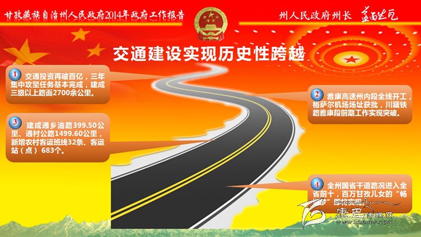 交通建設(shè)實(shí)現(xiàn)歷史性跨越。交通投資再破百億,建成三級(jí)以上路面2700余公里。雅康高速州內(nèi)段全線開工,格薩爾機(jī)場(chǎng)場(chǎng)址獲批,川藏鐵路雅康段前期工作實(shí)現(xiàn)突破。建成通鄉(xiāng)油路399.5公里、通村公路1499.6公里,新增農(nóng)村客運(yùn)班線32條、客運(yùn)站(點(diǎn)) 683個(gè)。全州國(guó)省干道路況進(jìn)入全省前十。徹底告別無(wú)電鄉(xiāng)歷史。完成投資100億元,“電力天路”等項(xiàng)目順利實(shí)施,“川藏聯(lián)網(wǎng)” 工程提前半年建成投運(yùn);18個(gè)縣實(shí)現(xiàn)與主網(wǎng)連網(wǎng);“遠(yuǎn)村點(diǎn)亮”全面完成。城鄉(xiāng)面貌煥然一新。堅(jiān)持建好縣城,全州市政基礎(chǔ)設(shè)施有效提升。堅(jiān)持做大集鎮(zhèn),改造小城鎮(zhèn)危舊房1118戶;投入1.34億元完善姑咱、馬尼干戈、香格里拉、八美4個(gè)省級(jí)“百鎮(zhèn)試點(diǎn)”鎮(zhèn)市政設(shè)施,13個(gè)鄉(xiāng)獲準(zhǔn)撤鄉(xiāng)建鎮(zhèn)。堅(jiān)持做美村寨,成功創(chuàng)建45個(gè)省級(jí)“美麗鄉(xiāng)村”示范村,19個(gè)州級(jí)幸福美麗新村試點(diǎn)建設(shè)全面啟動(dòng),打造新村聚居點(diǎn)235個(gè),建成藏區(qū)新居1.11萬(wàn)戶。全州城鎮(zhèn)化率達(dá)到27%。通信覆蓋越來(lái)越廣。完成投資4.53億元,國(guó)省干線和主要旅游景區(qū)通信網(wǎng)絡(luò)實(shí)現(xiàn)連續(xù)覆蓋。生態(tài)底色更加鮮明。編制完成《甘孜州生態(tài)文明建設(shè)規(guī)劃》,落實(shí)國(guó)家生態(tài)功能區(qū)轉(zhuǎn)移支付資金6.8億元,生態(tài)保護(hù)與建設(shè)工程加快推進(jìn),草原植被、森林覆蓋率分別達(dá)到78%、33.04%。