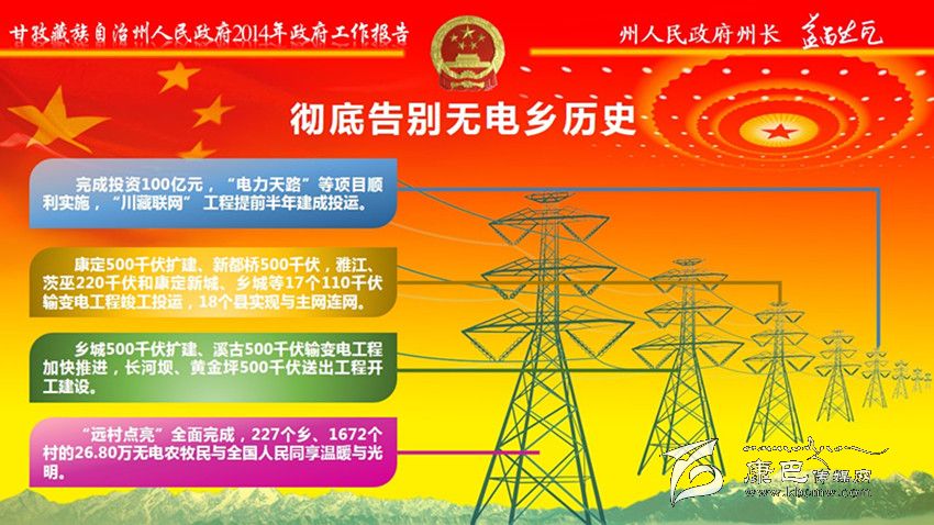 大力推進(jìn)電力通信建設(shè)。投入20億元,加快實(shí)施“電力天路”、無(wú)電地區(qū)電力建設(shè)新增項(xiàng)目和農(nóng)網(wǎng)改造升級(jí)工程,切實(shí)緩解邊遠(yuǎn)地區(qū)群眾缺電問(wèn)題;完成長(zhǎng)河壩電站500千伏等3個(gè)輸變電項(xiàng)目;統(tǒng)籌抓好表后入戶工程,確保群眾安全用電。投入6億元,新建通信光纜2360公里、基站1025個(gè),解決國(guó)省干道、旅游景區(qū)景點(diǎn)信號(hào)盲區(qū);新增30個(gè)自然村通電話、545個(gè)行政村通寬帶,出口總帶寬達(dá)到82G。