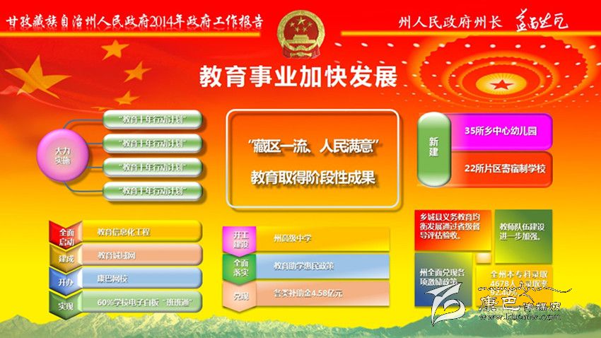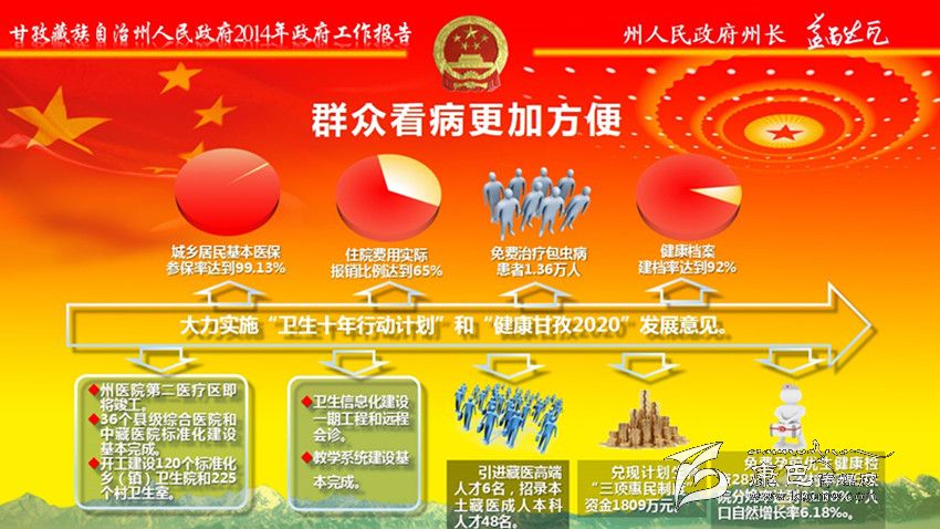 加大民生投入,全年民生支出139億元。全州城鎮(zhèn)新增就業(yè)7400人,城鄉(xiāng)低保實(shí)現(xiàn)應(yīng)保盡保;在全省民族地區(qū)率先實(shí)施醫(yī)療保險(xiǎn)制度城鄉(xiāng)統(tǒng)籌,異地就醫(yī)即時(shí)結(jié)算全面啟動(dòng);在全省率先出臺(tái)大病醫(yī)療保險(xiǎn)規(guī)定。教育事業(yè)加快發(fā)展。新建35所鄉(xiāng)中心幼兒園、22所片區(qū)寄宿制學(xué)校,州高級(jí)中學(xué)開工建設(shè)。全面落實(shí)教育助學(xué)惠民政策,兌現(xiàn)各類補(bǔ)助金4.58億元。城鄉(xiāng)居民基本醫(yī)保參保率達(dá)到99.13%,健康檔案建檔率達(dá)到92%;開工建設(shè)120個(gè)標(biāo)準(zhǔn)化鄉(xiāng)(鎮(zhèn))衛(wèi)生院和225個(gè)村衛(wèi)生室;衛(wèi)生信息化建設(shè)一期工程和遠(yuǎn)程會(huì)診、教學(xué)系統(tǒng)建設(shè)基本完成;兌現(xiàn)計(jì)劃生育“三項(xiàng)惠民制度”資金1809萬(wàn)元。群眾文化生活日益豐富。建成縣“兩館”12個(gè);開工建設(shè)州民族體育館、州農(nóng)牧民演藝培訓(xùn)中心和14個(gè)縣級(jí)全民健身中心,建成農(nóng)民體育健身工程739個(gè);開展 “送文化下鄉(xiāng)”近千場(chǎng);康巴文化研究院“四大工程”全面啟動(dòng)。深入實(shí)施“百千萬(wàn)康巴英才工程”,人才科技工作扎實(shí)有效。扶貧移民工作成效明顯。完成1360個(gè)貧困村、19.91萬(wàn)扶貧對(duì)象立卡建檔工作;實(shí)施整村推進(jìn)63個(gè)、連片開發(fā)項(xiàng)目4個(gè)、彝家新寨(村)17個(gè)、索改橋23座,易地扶貧搬遷9850人,2.65萬(wàn)群眾生產(chǎn)生活條件得到改善。