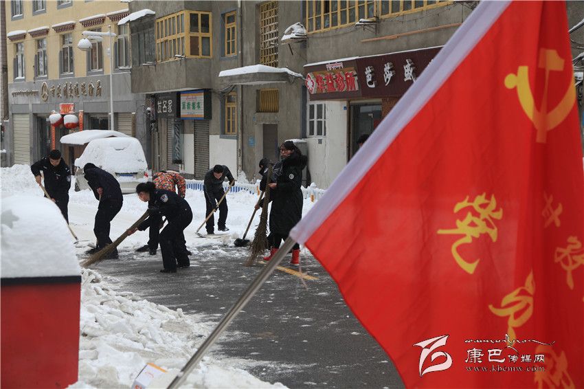一陣鐵鏟的撞擊聲把記者吸引到了州公安局辦公大樓附近,大雪中,一面寫有黨員突擊隊(duì)字樣的紅旗格外引人注目。經(jīng)過(guò)訊問記者得知,這支鏟雪隊(duì)是由州公安局的黨員和民警組成的,因?yàn)橥k姡偌又l(fā)現(xiàn)辦公樓外的街道上積雪太厚,給行車、行人造成了不少麻煩,所以州公安局的黨員、民警組成了這支臨時(shí)突擊隊(duì),分成兩個(gè)小組分頭突擊。在他們身后,已經(jīng)有數(shù)百米街道上的積雪被清除。此外,在將軍橋附近,武警官兵也加入到清理積雪的行列,那道橄欖綠在雪中顯得格外美麗。