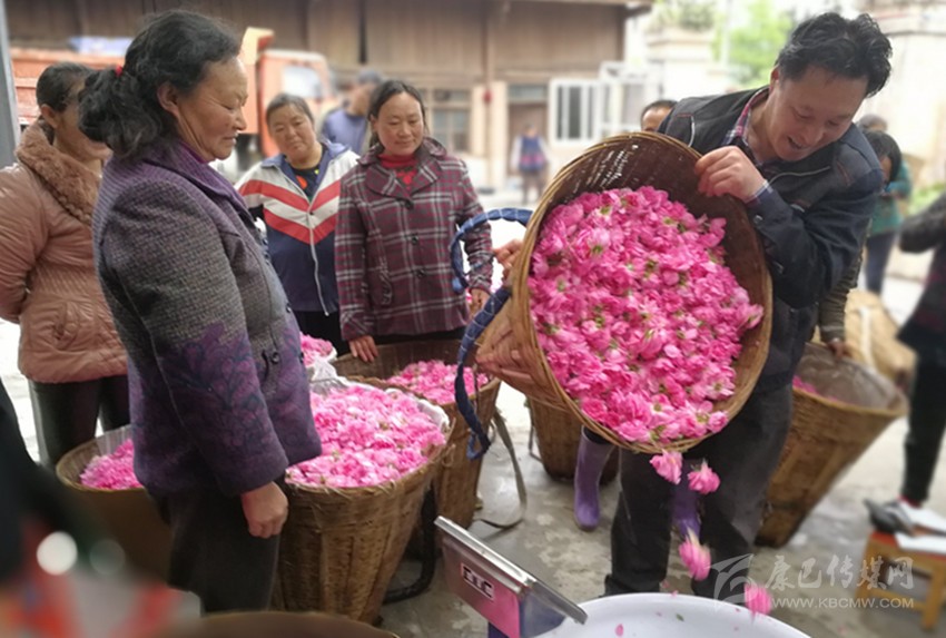 16日上午,小雨停了下來(lái),趕在太陽(yáng)出來(lái)之前采摘的玫瑰花出油率好,是采摘的黃金時(shí)間。在燕子溝鎮(zhèn)新龍門(mén)子村生產(chǎn)加工點(diǎn),周邊農(nóng)戶將采摘的粉色玫瑰花瓣過(guò)秤,逐筐倒進(jìn)特定的堆放地點(diǎn),農(nóng)戶們也收到了應(yīng)得的勞務(wù)收入,空氣中彌漫著一股玫瑰花特有的芳香和浪漫,也充滿了當(dāng)?shù)匕傩招腋:吞鹈鄣奈兜馈?/span>