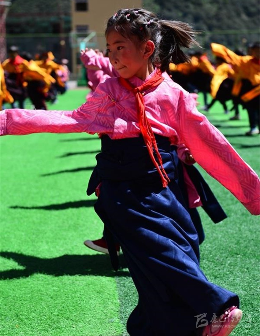 雅江縣呷拉鎮(zhèn)片區(qū)寄宿制操場上,身著民族服飾的學(xué)生們跳課間舞。