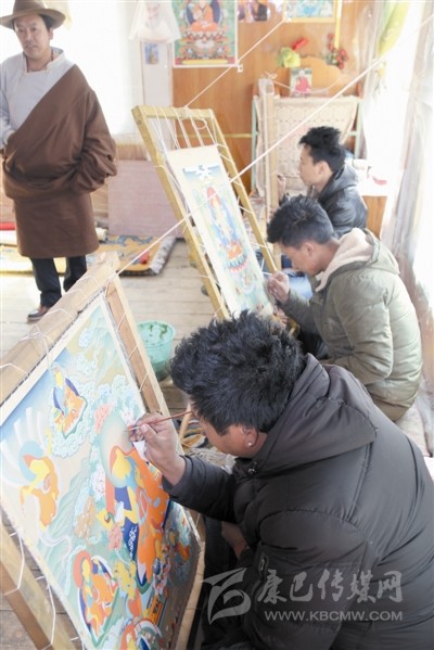 白玉河坡省級非遺代表性傳承人根秋單貞指導(dǎo)唐卡繪畫。
