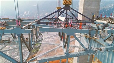 針對這一難題,建設(shè)中創(chuàng)新纜索吊裝系統(tǒng)設(shè)計:一是優(yōu)化吊裝使用的支索器,增加主纜抗風(fēng)穩(wěn)定性,使?fàn)恳K不致纏繞;二是找準(zhǔn)風(fēng)場規(guī)律,確定有效施工時間為早上6點至7點開始起吊,12點之前完成全部吊裝作業(yè);三是制定和完善吊裝作業(yè)的管理體制體系,增設(shè)視頻和音頻監(jiān)控系統(tǒng),提升作業(yè)規(guī)范性。通過上述措施有效的保障了鋼桁梁吊裝的順利完成。從2017年9月26日開始吊裝鋼桁梁,到2018年2月6日勝利合龍,共歷時133天。