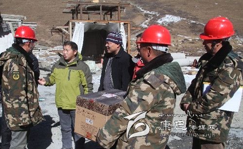 為打好今年交通攻堅大決戰(zhàn),我州所有在建公路隧道冬季不停工,部分工程技術(shù)人員和民工將放棄春節(jié)與家人團(tuán)聚。日前,受州委、州政府領(lǐng)導(dǎo)的委托,州政府副秘書長、州交通協(xié)調(diào)辦主任高見在前往石渠走訪“親戚”途中,專程看望慰問了國道317線雀兒山隧道和省道217線石馬路海子山隧道的工程技術(shù)人員和民工,并轉(zhuǎn)達(dá)了州委、州政府領(lǐng)導(dǎo)的親切問候。圖為在海子隧道施工現(xiàn)場慰問時的場景。(本網(wǎng)記者 攝影報道)